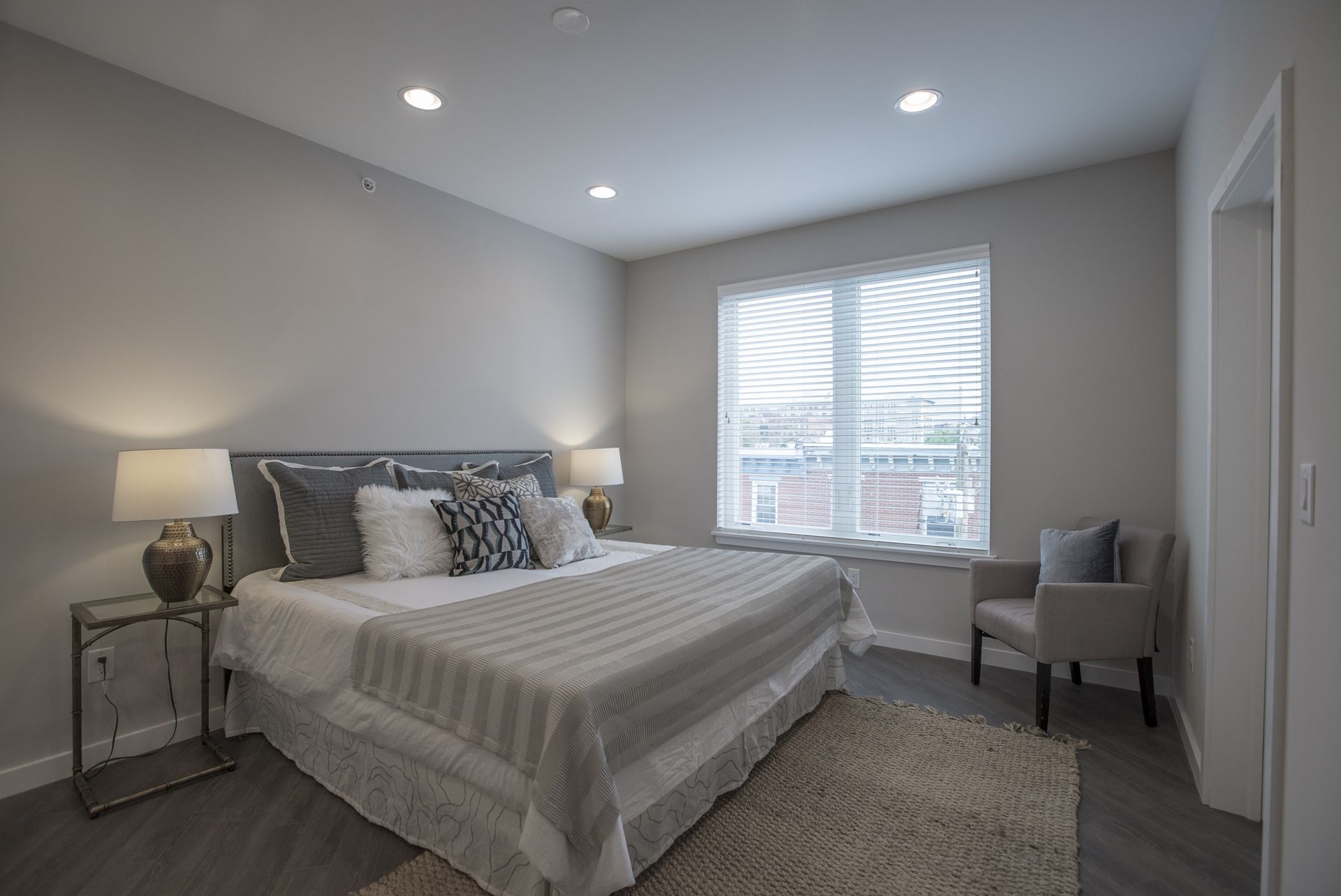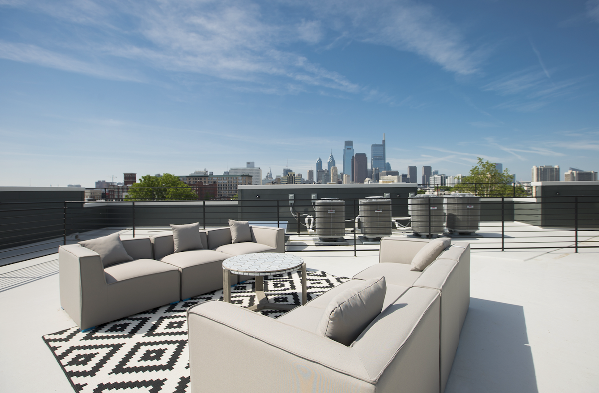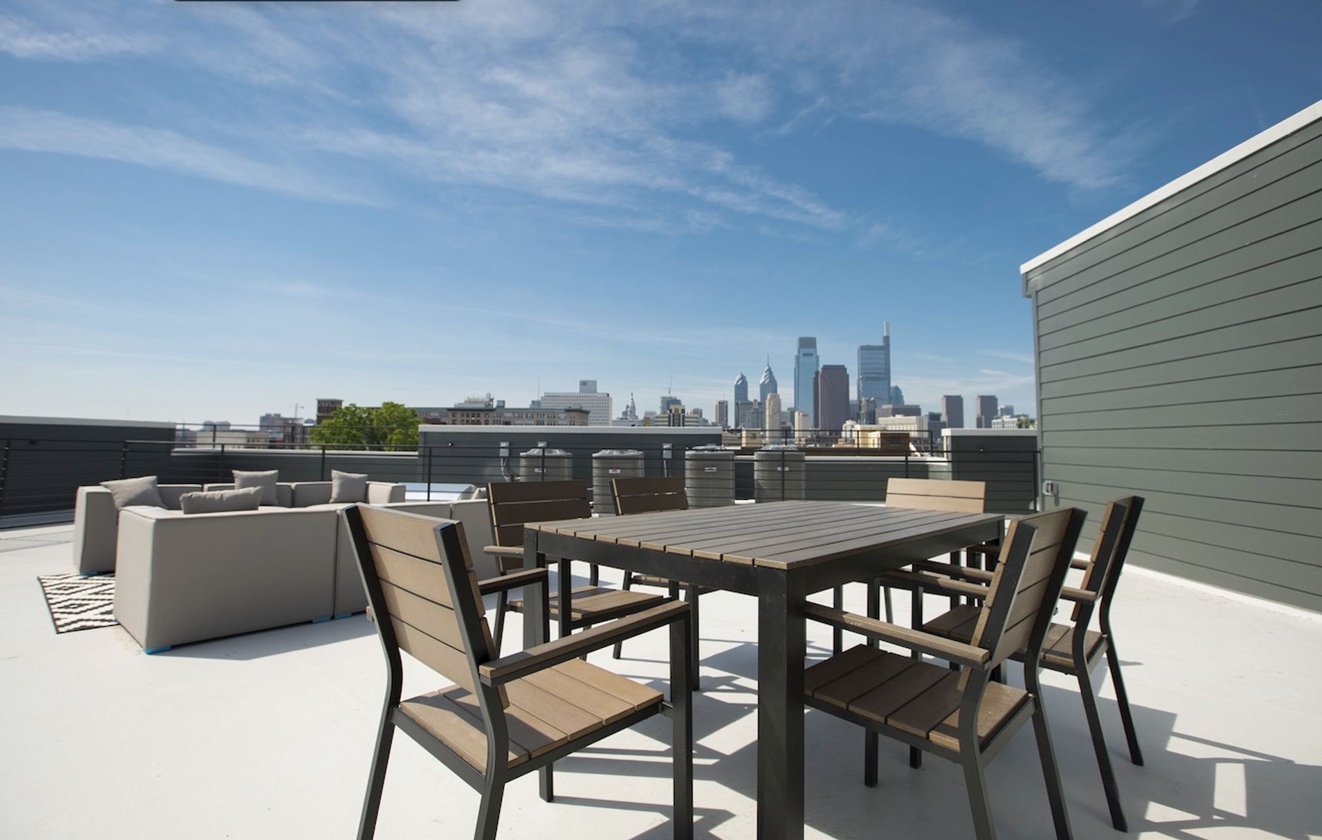 Residents of The Gateway can enjoy a fully furnished rooftop deck with stunning views of the Center City skyline. All units feature modern quartz countertops, 42-inch white shaker cabinetry, high-end stainless steel appliances, luxury tile selections, custom California-style built-in closets, double sink vanities, glass-enclosed showers, in-unit laundry, and plenty of natural light from the floor-to-ceiling windows.