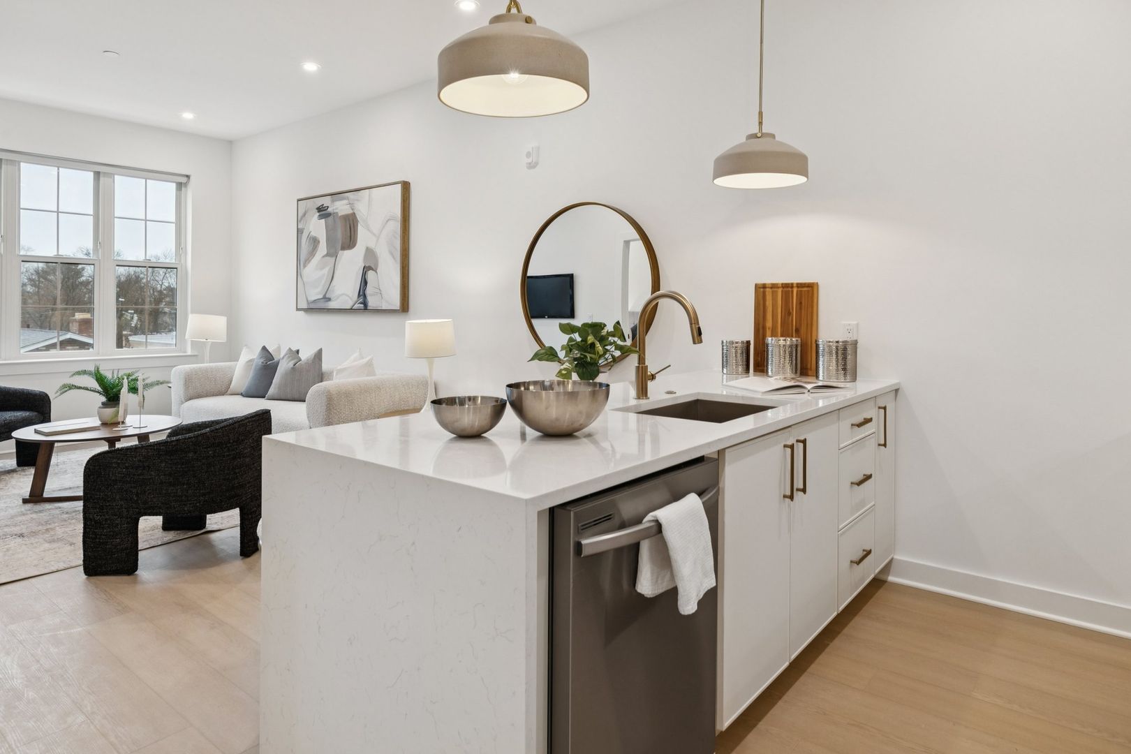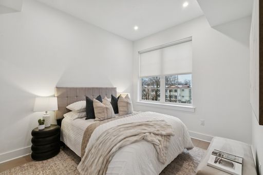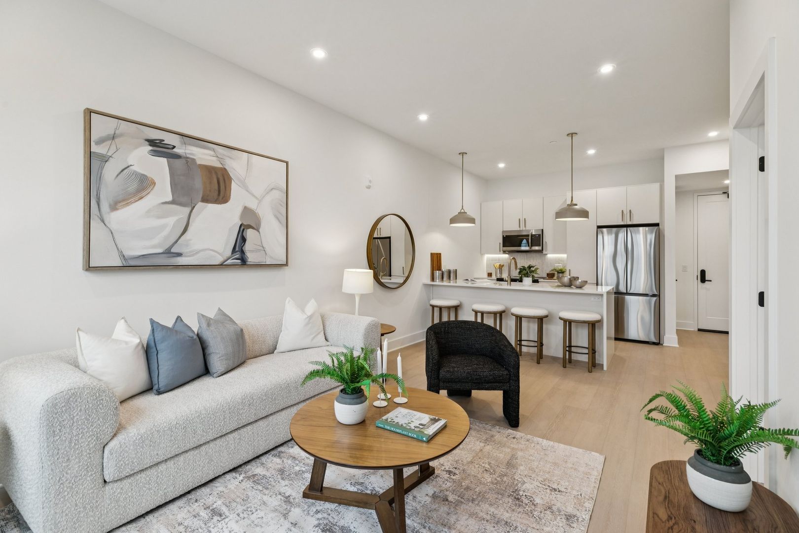 Inside each residence, contemporary interiors blend modern sophistication with the timeless character of the surrounding neighborhood. Apartment homes are outfitted with Samsung stainless steel appliances, classic shaker-style cabinetry, stunning waterfall quartz countertops and backsplashes, Latch smart access, smart thermostats, custom closet systems, built-in mudrooms, and spacious, open layouts designed for both style and functionality.