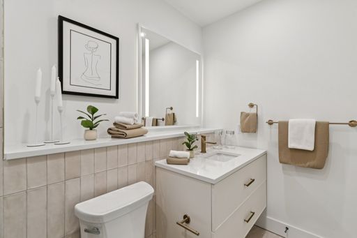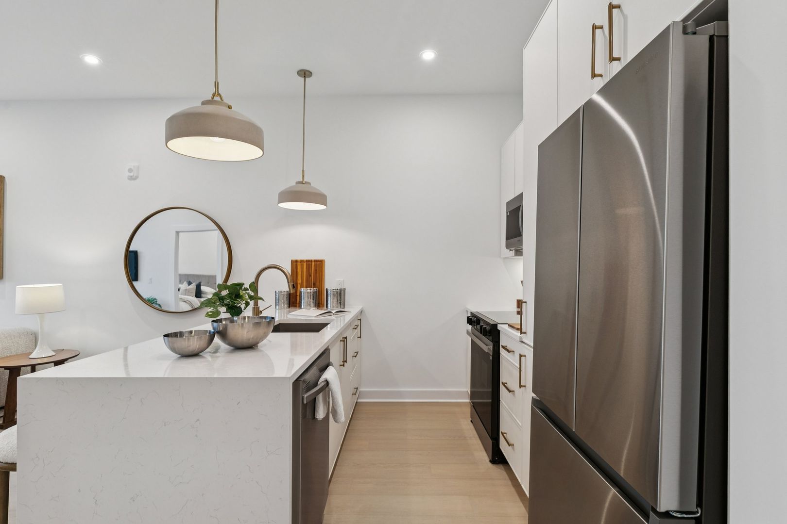 Inside each residence, contemporary interiors blend modern sophistication with the timeless character of the surrounding neighborhood. Apartment homes are outfitted with Samsung stainless steel appliances, classic shaker-style cabinetry, stunning waterfall quartz countertops and backsplashes, Latch smart access, smart thermostats, custom closet systems, built-in mudrooms, and spacious, open layouts designed for both style and functionality.