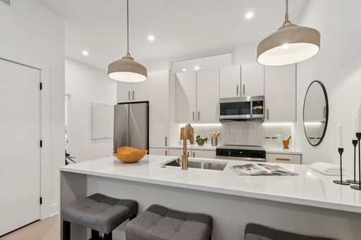 Inside each residence, contemporary interiors blend modern sophistication with the timeless character of the surrounding neighborhood. Apartment homes are outfitted with Samsung stainless steel appliances, classic shaker-style cabinetry, stunning waterfall quartz countertops and backsplashes, Latch smart access, smart thermostats, custom closet systems, built-in mudrooms, and spacious, open layouts designed for both style and functionality.
