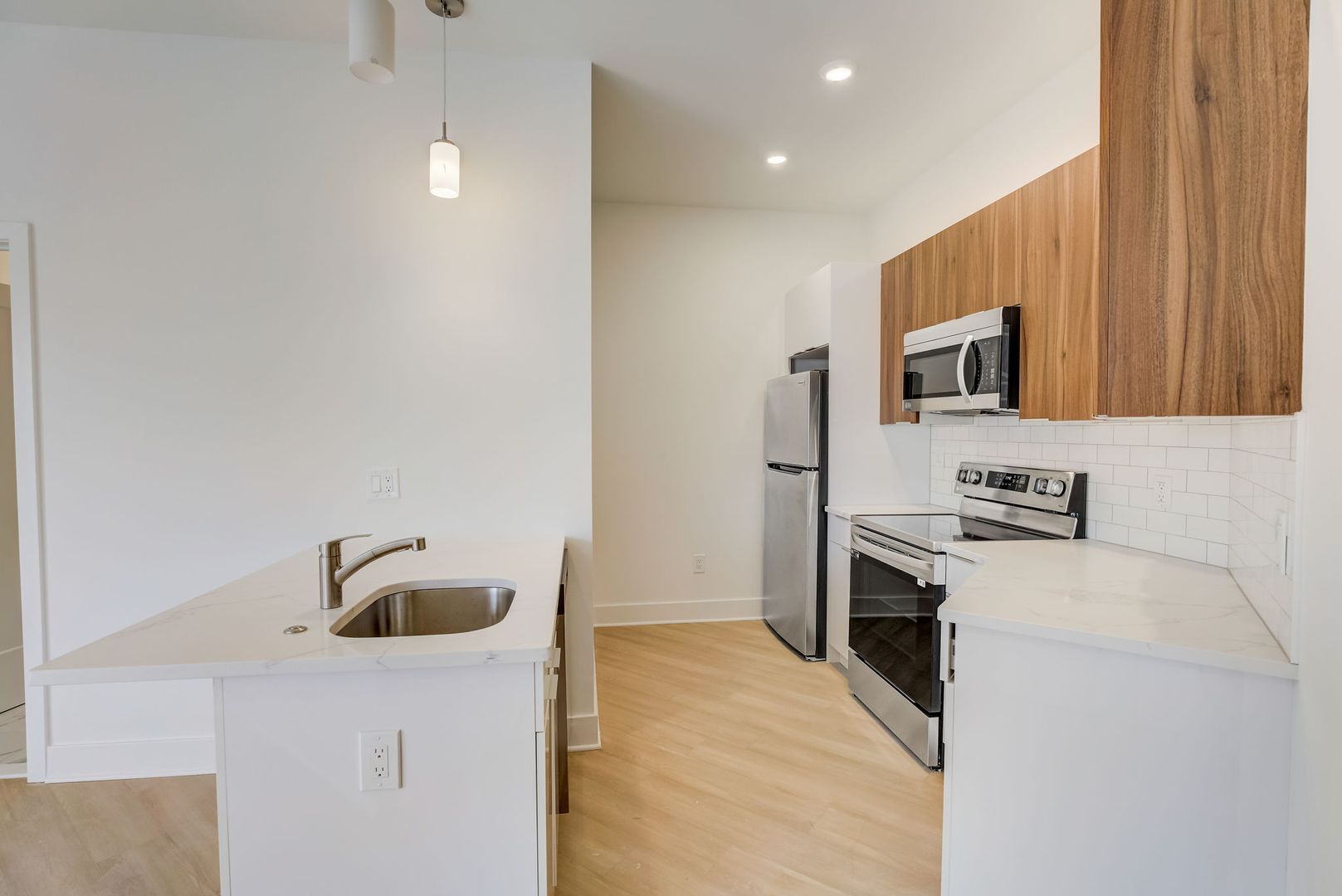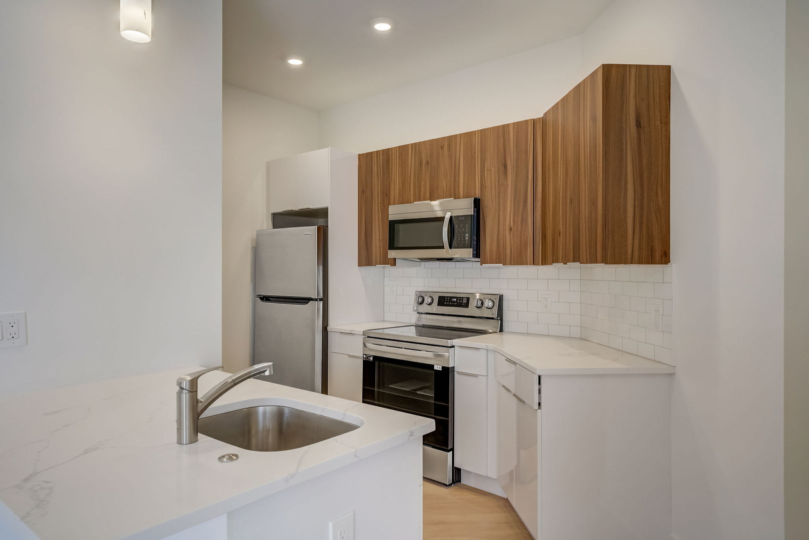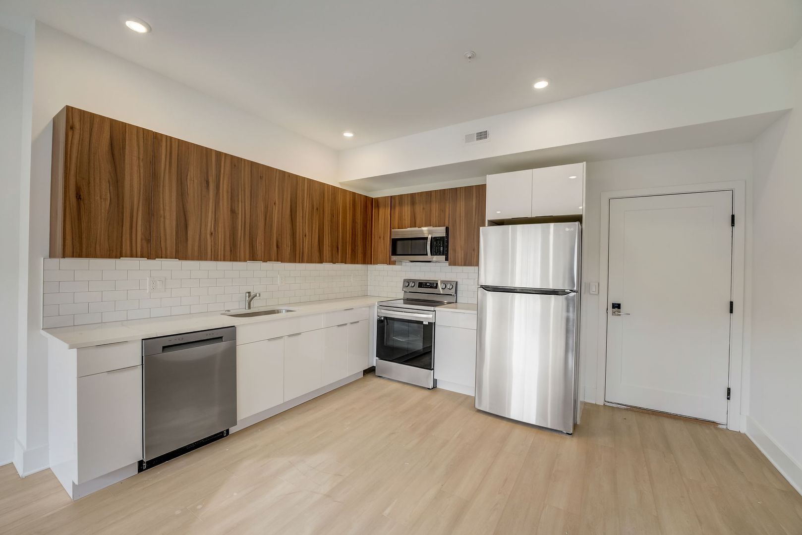 Step inside and you’re immediately greeted by abundant natural light pouring through large windows into the open-concept kitchen and living area. The kitchen is a true highlight, featuring two-tone white and wood cabinetry, stainless steel appliances (including a dishwasher), modern subway tile backsplash, and gorgeous hardwood flooring throughout. The spacious living area provides plenty of room for both relaxation and a home office setup, while the bedroom comfortably accommodates a queen-sized bed and includes generous closet space.