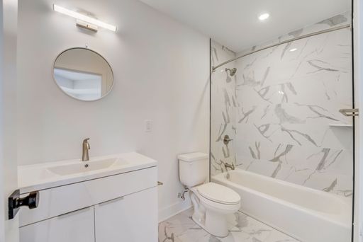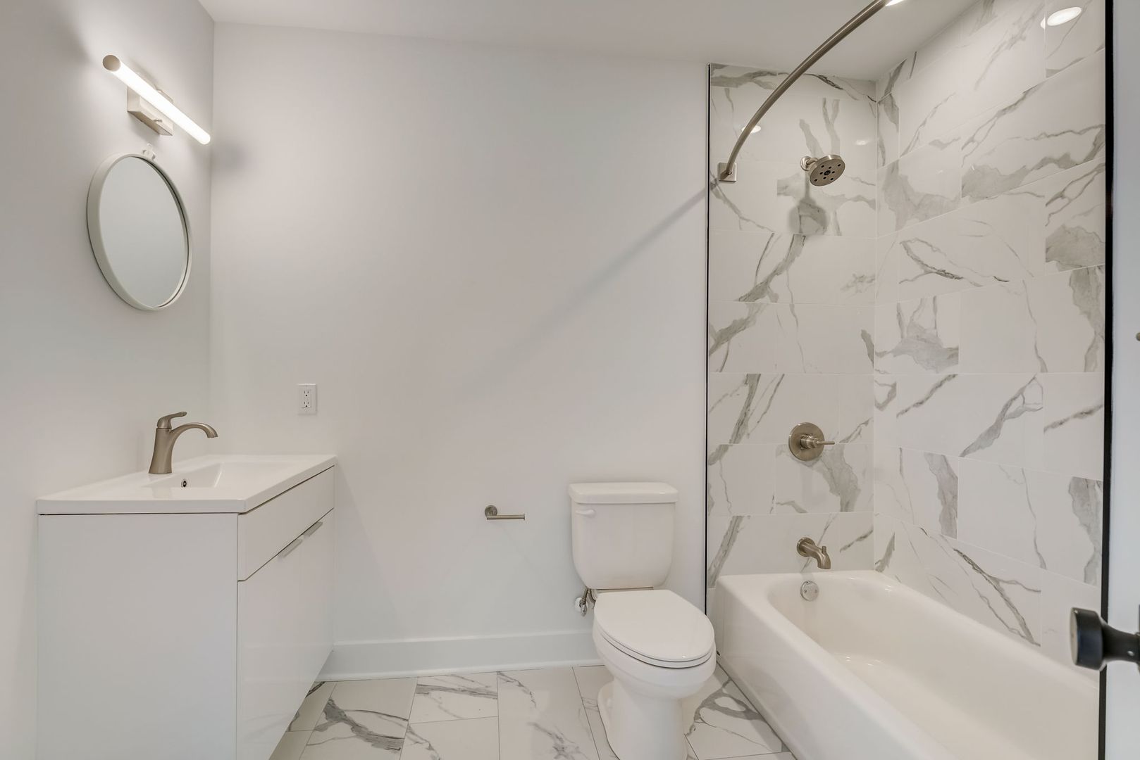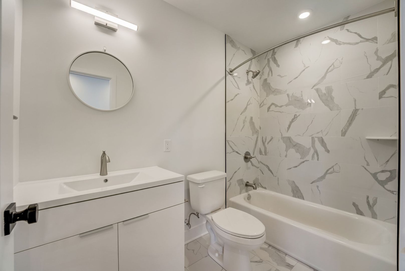 The elegant bathroom is finished with white and gray marble tile in the tub/shower combo, creating a clean, modern aesthetic that ties the entire space together.