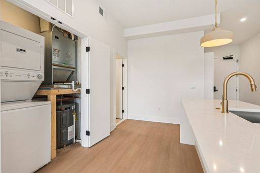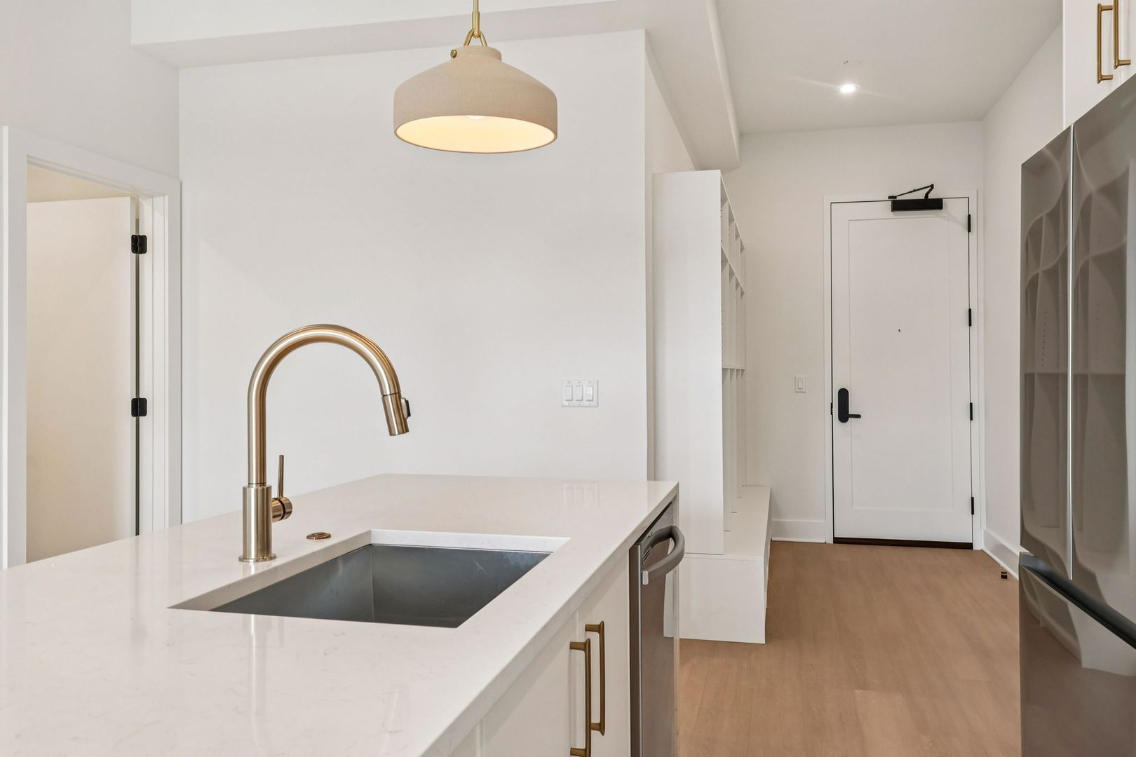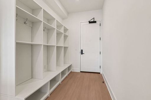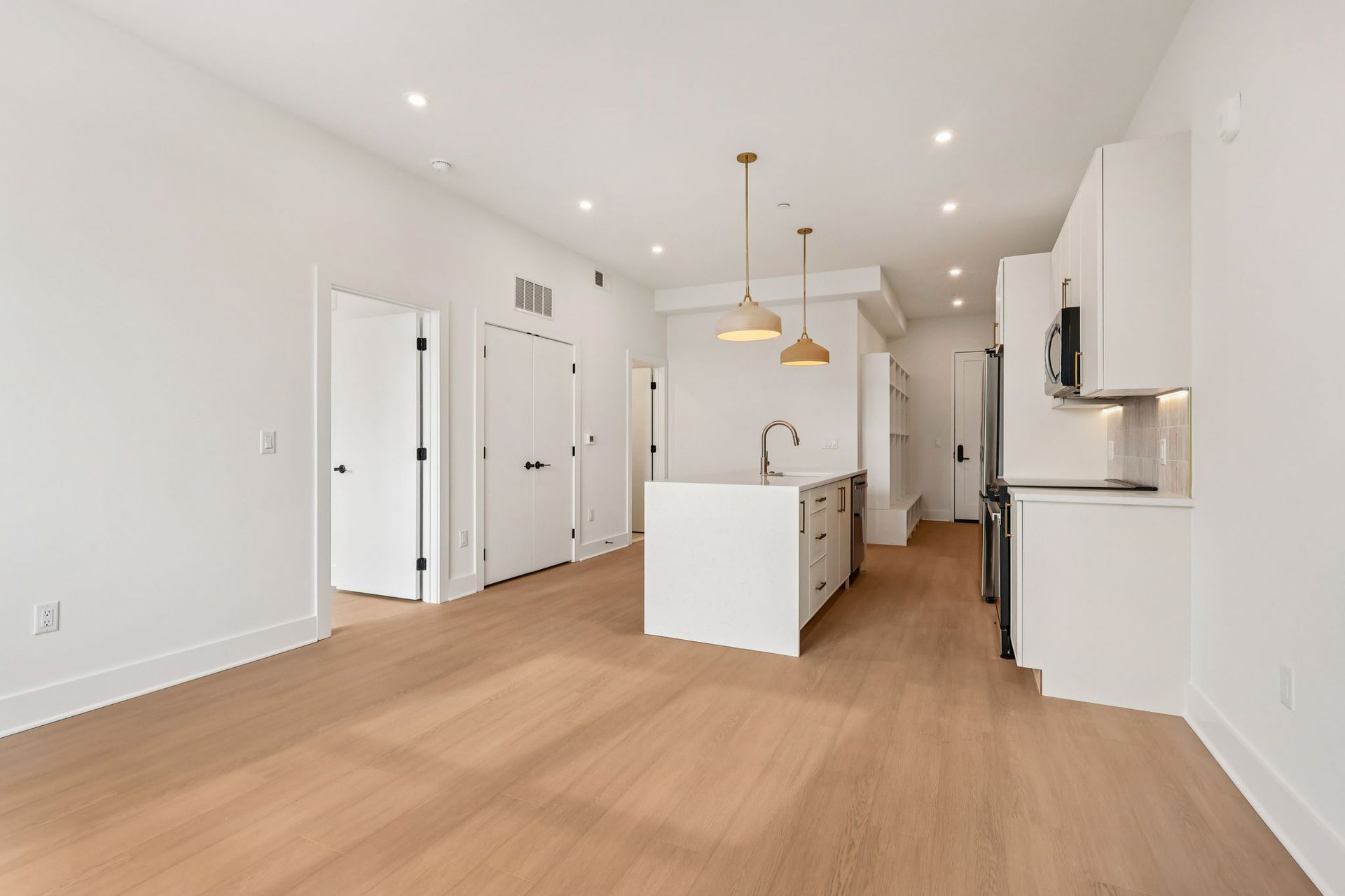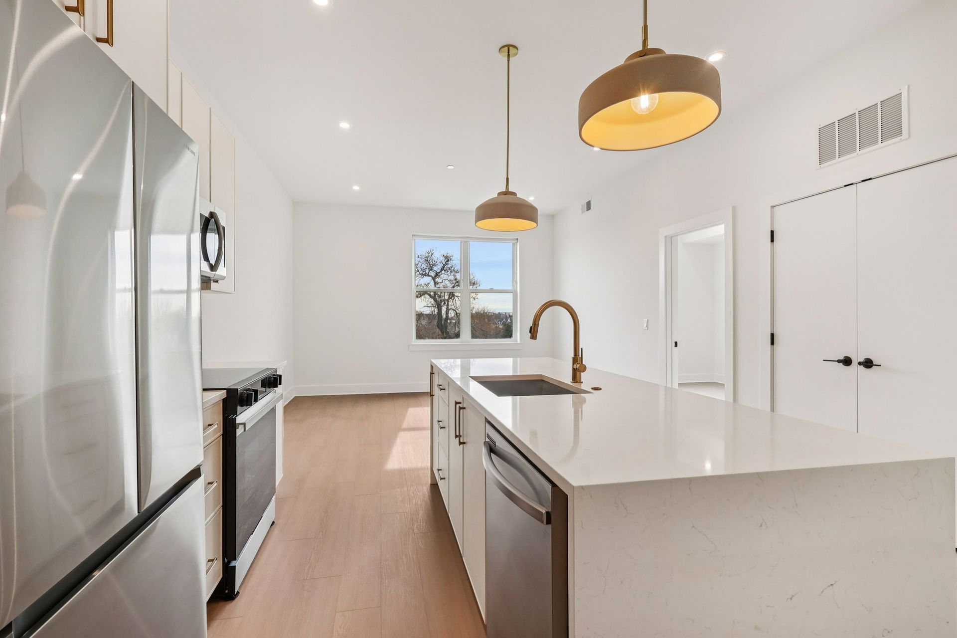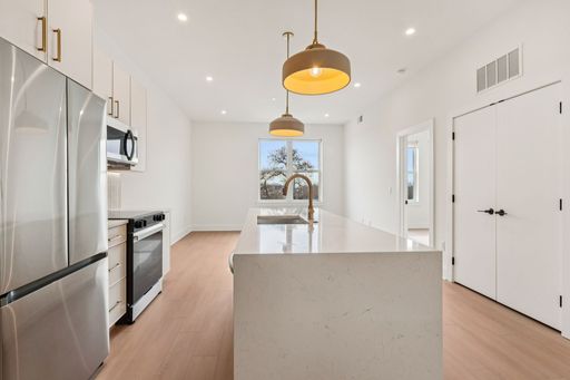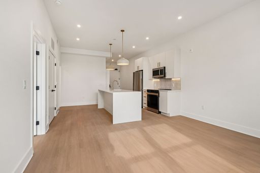 Inside each residence, contemporary interiors blend modern sophistication with the timeless character of the surrounding neighborhood. Apartment homes are outfitted with Samsung stainless steel appliances, classic shaker-style cabinetry, stunning waterfall quartz countertops and backsplashes, Latch smart access, smart thermostats, custom closet systems, built-in mudrooms, and spacious, open layouts designed for both style and functionality.