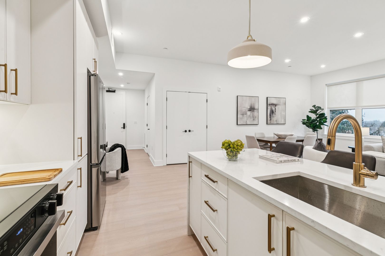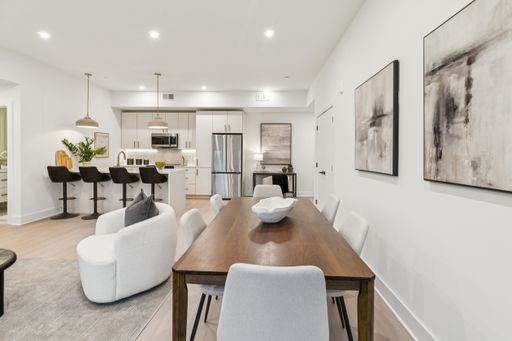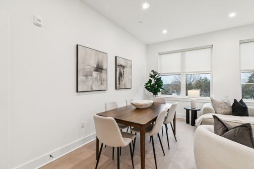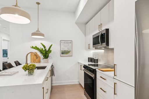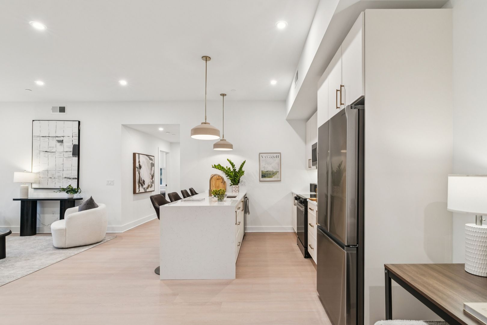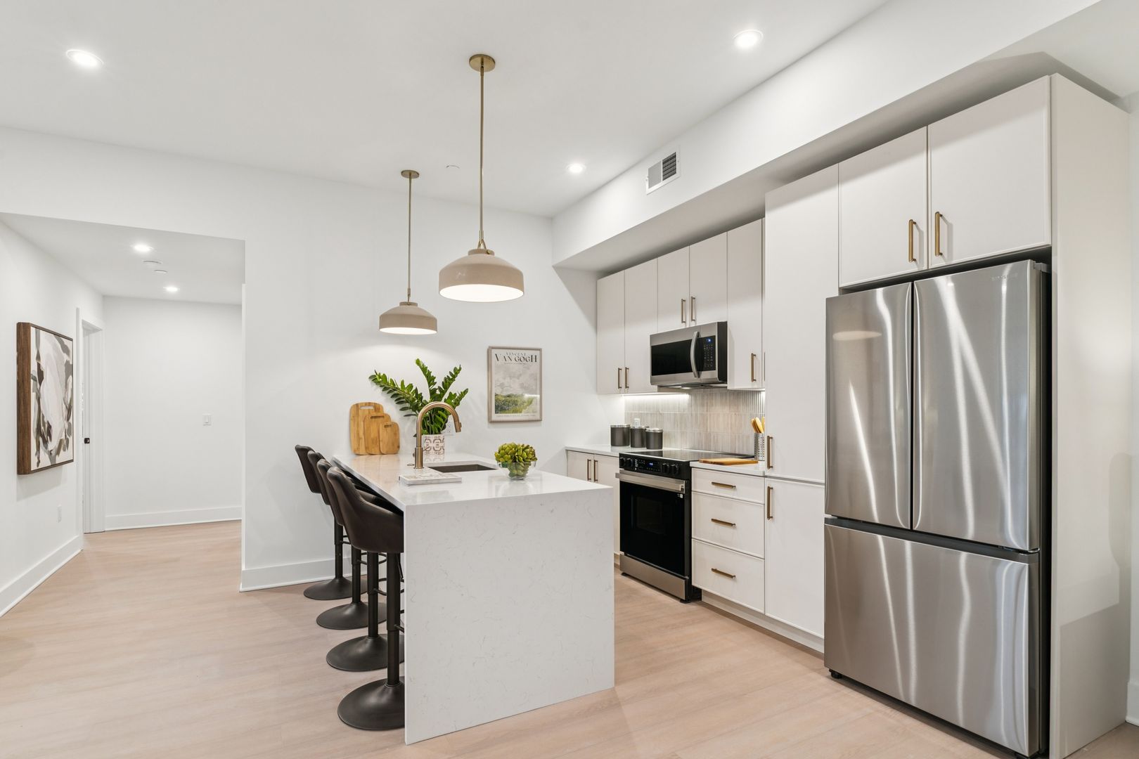 Inside each residence, contemporary interiors blend modern sophistication with the timeless character of the surrounding neighborhood. Apartment homes are outfitted with Samsung stainless steel appliances, classic shaker-style cabinetry, stunning waterfall quartz countertops and backsplashes, Latch smart access, smart thermostats, custom closet systems, built-in mudrooms, and spacious, open layouts designed for both style and functionality.