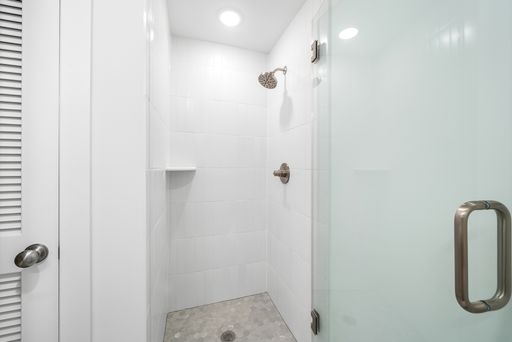 The spacious living areas easily accommodate furniture and home office setups, while bedrooms comfortably fit queen-sized beds and provide excellent closet storage. The elegant bathrooms are designed with white and gray marble tile and sleek fixtures, creating a clean, contemporary atmosphere.