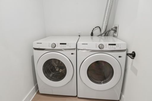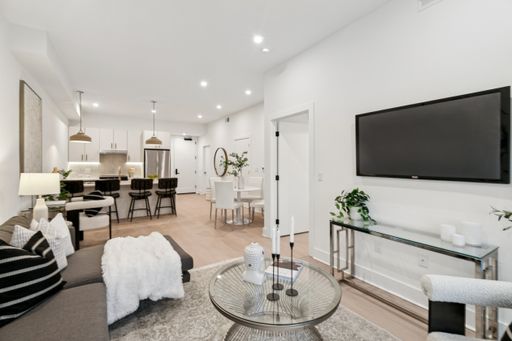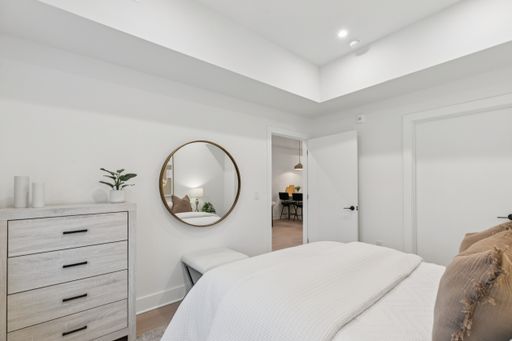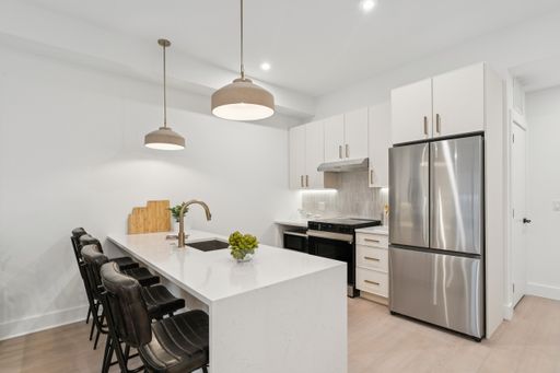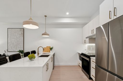 Inside each residence, contemporary interiors blend modern sophistication with the timeless character of the surrounding neighborhood. Apartment homes are outfitted with Samsung stainless steel appliances, classic shaker-style cabinetry, stunning waterfall quartz countertops and backsplashes, Latch smart access, smart thermostats, custom closet systems, built-in mudrooms, and spacious, open layouts designed for both style and functionality.