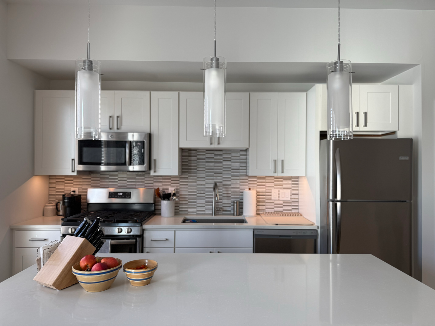 The contemporary kitchens are equipped with quartz countertops, shaker-style cabinetry, and stainless steel appliances. Additional amenities include in-unit laundry, central air, and thoughtfully designed finishes throughout.