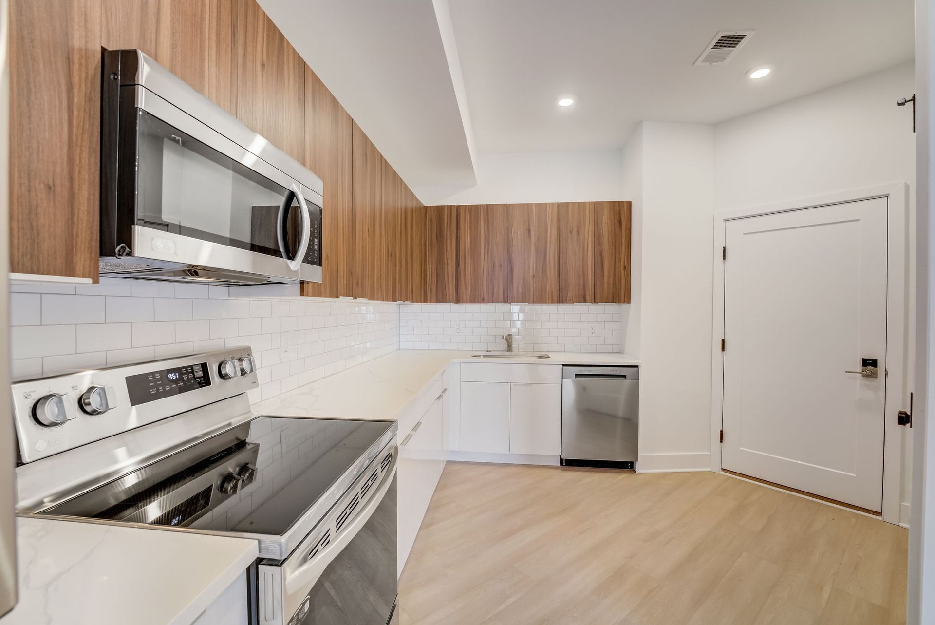 Step inside and you’re immediately greeted by abundant natural light pouring through large windows into the open-concept kitchen and living area. The kitchen is a true highlight, featuring two-tone white and wood cabinetry, stainless steel appliances (including a dishwasher), modern subway tile backsplash, and gorgeous hardwood flooring throughout. The spacious living area provides plenty of room for both relaxation and a home office setup, while the bedroom comfortably accommodates a queen-sized bed and includes generous closet space.