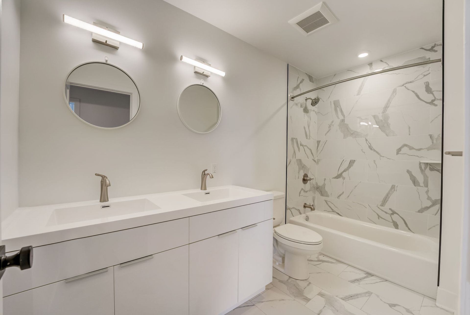 The elegant bathroom is finished with white and gray marble tile in the tub/shower combo, creating a clean, modern aesthetic that ties the entire space together.