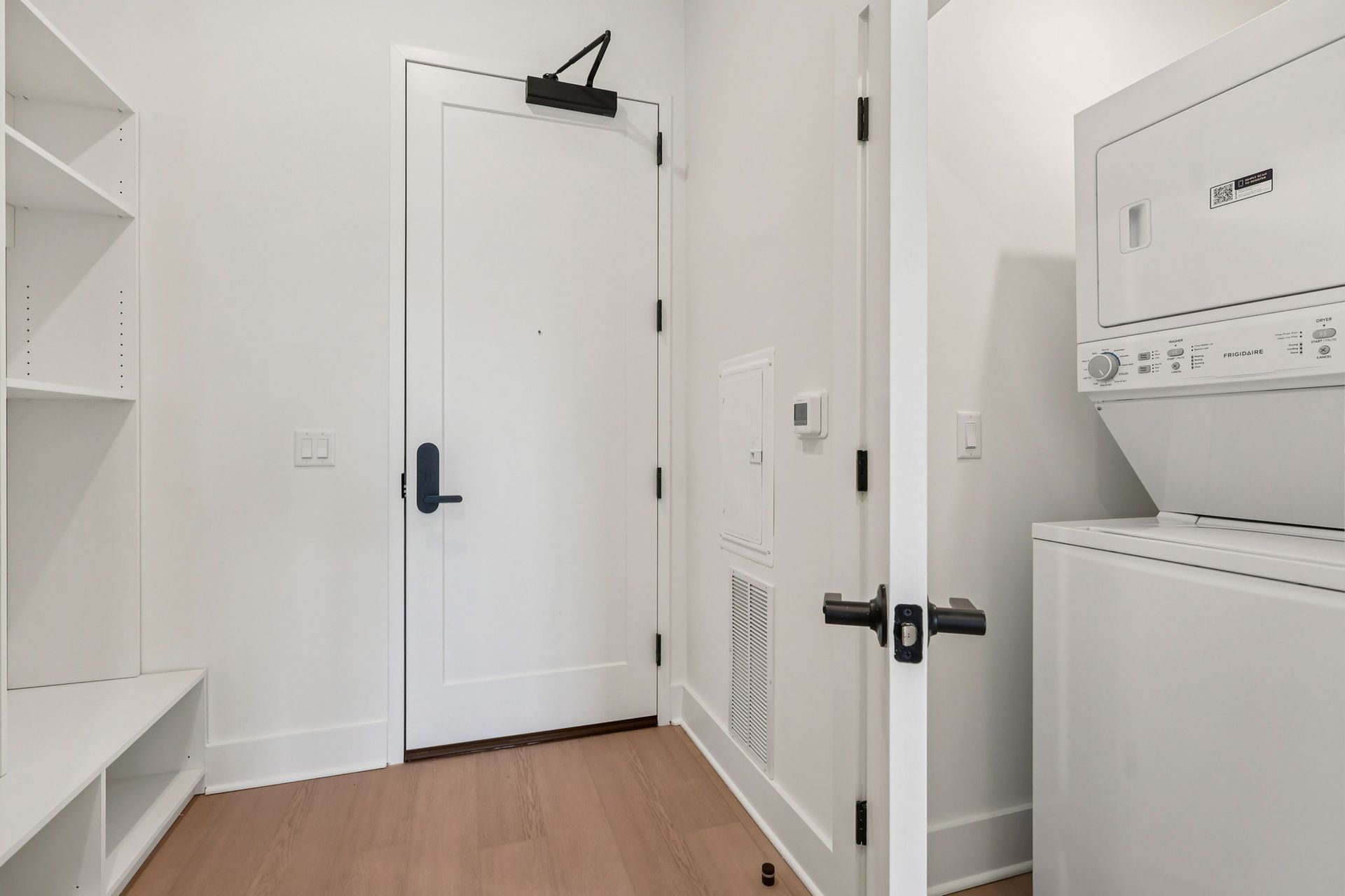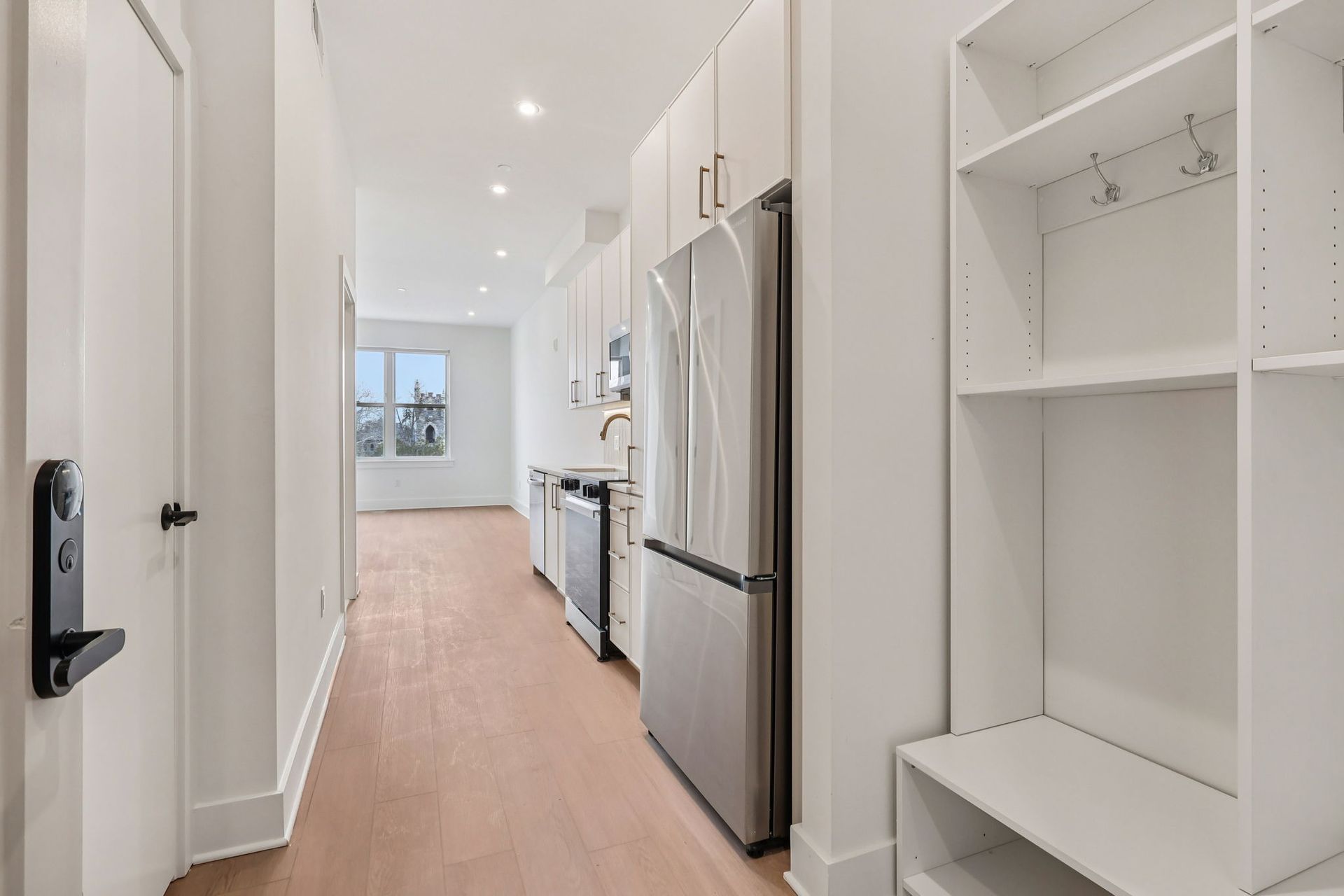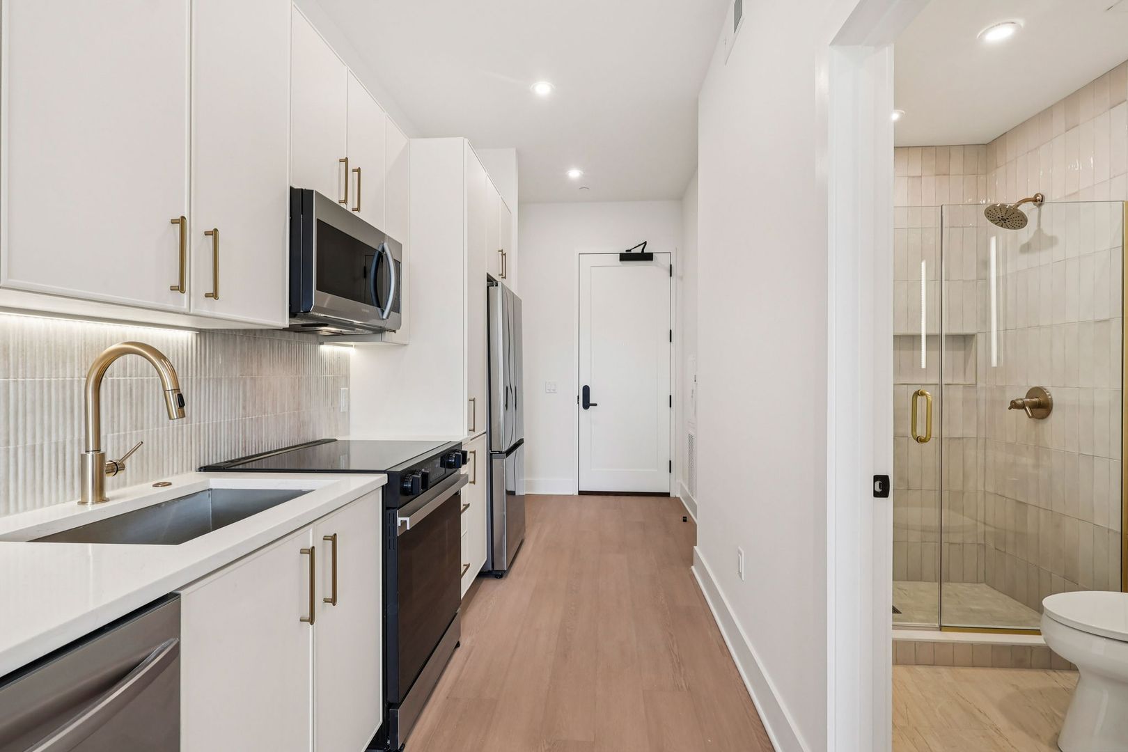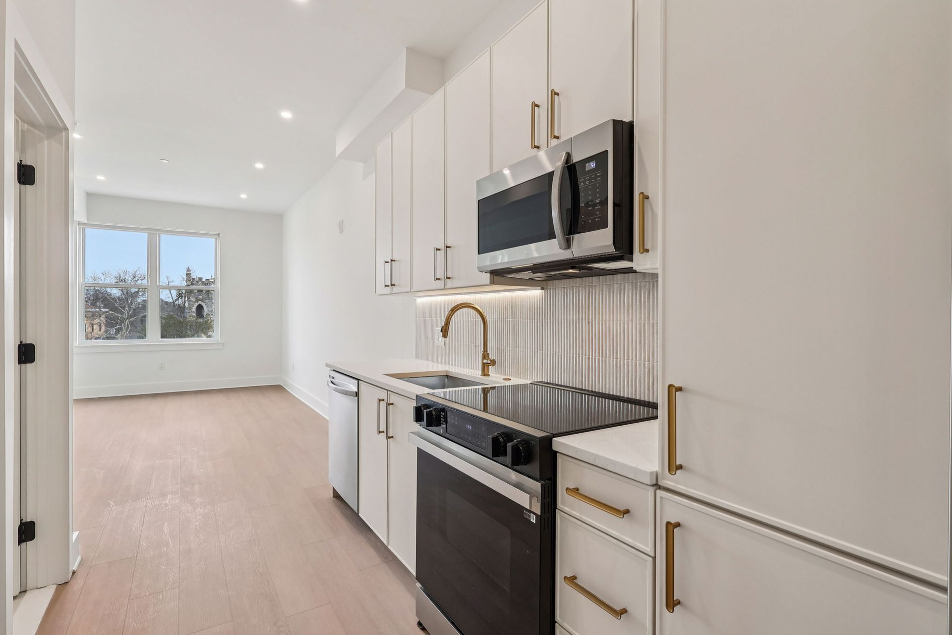 Inside each residence, contemporary interiors blend modern sophistication with the timeless character of the surrounding neighborhood. Apartment homes are outfitted with Samsung stainless steel appliances, classic shaker-style cabinetry, stunning waterfall quartz countertops and backsplashes, Latch smart access, smart thermostats, custom closet systems, built-in mudrooms, and spacious, open layouts designed for both style and functionality.