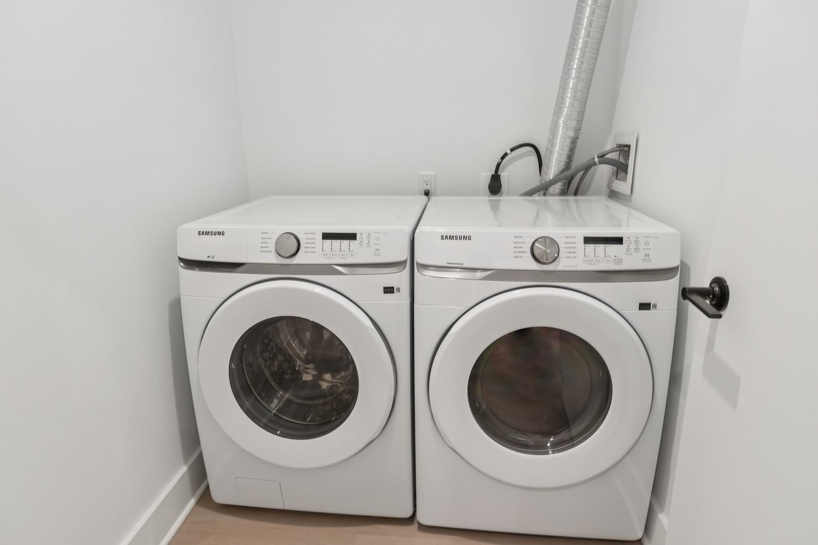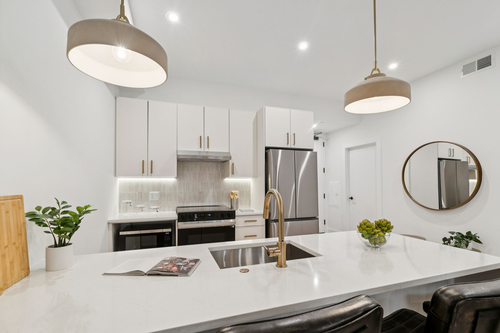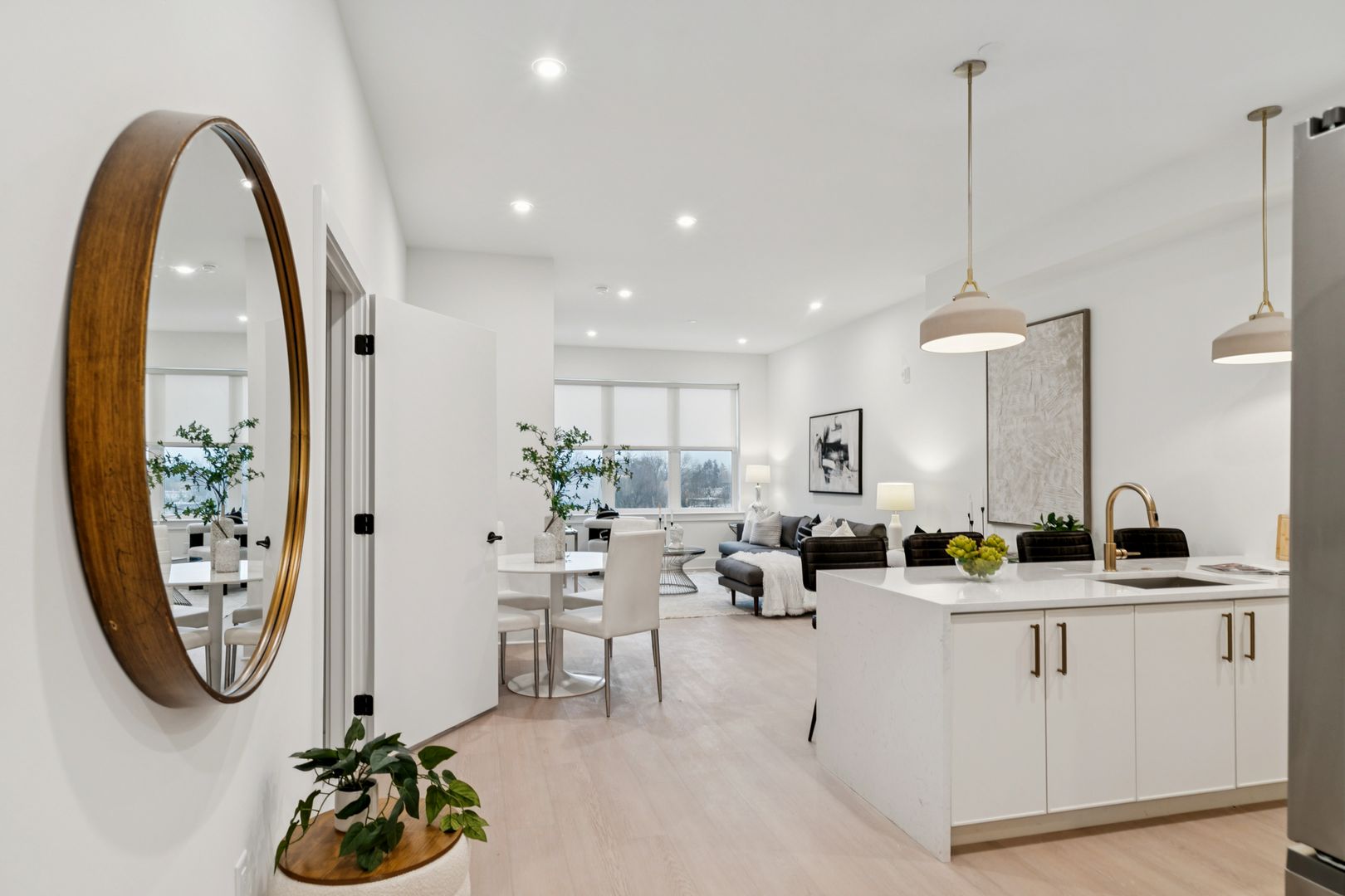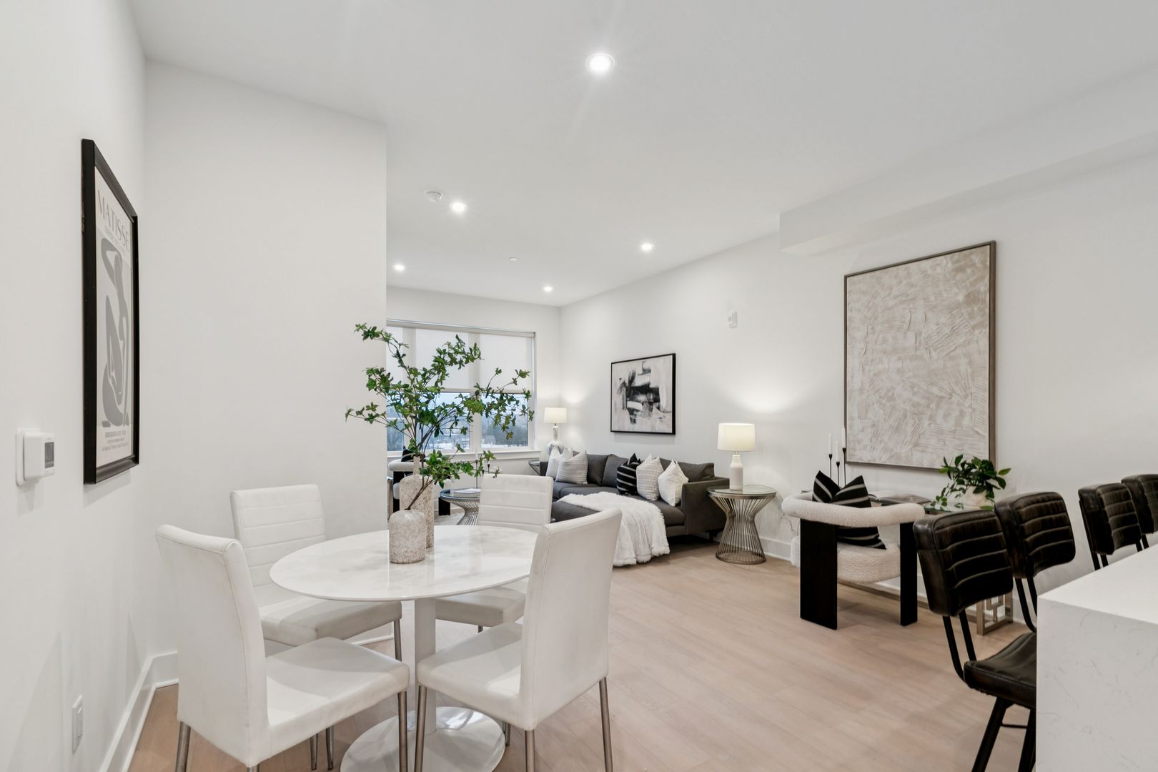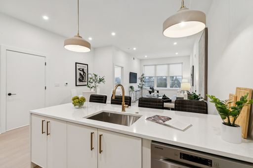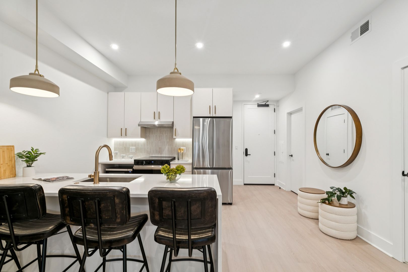 Inside each residence, contemporary interiors blend modern sophistication with the timeless character of the surrounding neighborhood. Apartment homes are outfitted with Samsung stainless steel appliances, classic shaker-style cabinetry, stunning waterfall quartz countertops and backsplashes, Latch smart access, smart thermostats, custom closet systems, built-in mudrooms, and spacious, open layouts designed for both style and functionality.